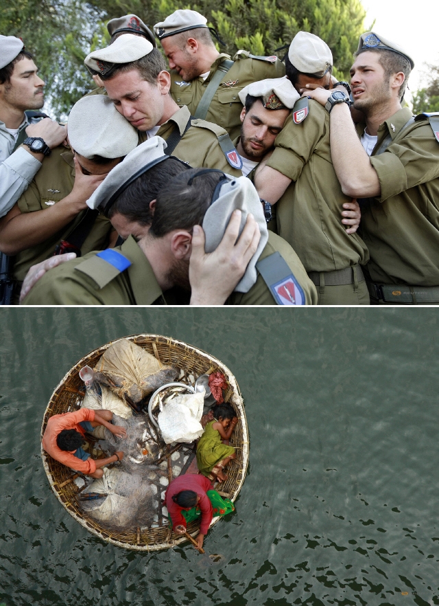 2009년 팔레스타인 가자지구 작전에서 전사한 전우의 장례식에서 뒤엉켜 우는 이스라엘 군인들(‘이모션’ 섹션·위쪽), 2011년 인도 남부 페리야르강의 광주리 배에서 그물을 정리하는 남편과 노 젓는 아내(‘에필로그’ 섹션).