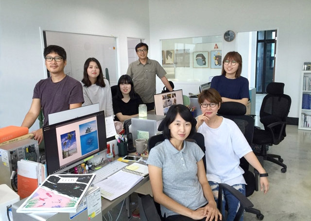 고선영 <제주인> 대표(앞에서 두 번째)와 임직원들이 제주 서귀포시 안덕면 사계리 재주상회 사무실에 모였다. 출퇴근 시간이 비교적 자유롭고 밖에서 일하는 경우도 잦아 사무실에 다 같이 모일 기회는 많지 않다고 한다. 재주상회 제공