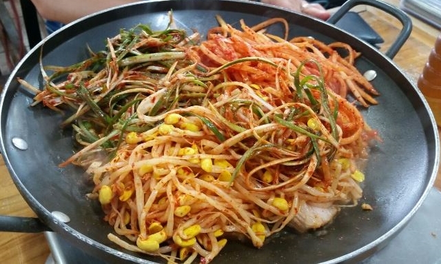 서귀포 두루치기로 따지자면, 1인분 3천원의 ‘혜자가격’(가격 대비 훌륭한 맛이라는 뜻의 신조어)을 자랑하고 술을 팔지 않는 것으로 유명했던 용이식당이 있다지만, 나는 토평 동성식당을 더 애정한다. 제주 돼지 삼겹살을 먼저 굽다가 콩나물과 무채, 파채, 감자를 통째로 볼 넓은 냄비에 쏟아넣고 함께 볶으면 끝. 함께 나오는 미역오이냉국은 몇 번이나 리필했는지 기억도 나지 않는다. 동성식당이 위치한 토평동은 감귤밭과 공업단지, 군부대가 인접한 지역이라 점심·저녁 시간에 오는 손님들이 대부분 노동자다. 제주인의 진짜 흙 묻은 숟가락질의 역사가 이 집에 있다.