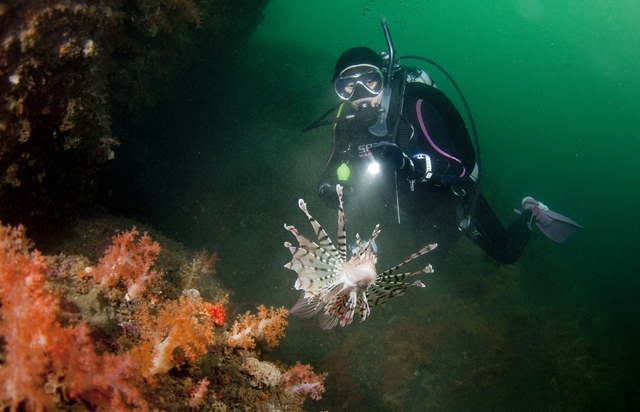 제주 서귀포 섶섬 큰한개창에서 조혜정 기자가 점쏠배감펭 한 마리를 바라보며 유영하고 있다. 한겨레 김정효 기자