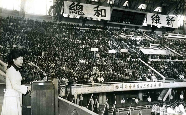 1977년 박정희 정권은 새마음갖기 국민운동을 시작했다. 국민의 심리를 흔들어 ‘반국가적 행동은 위험한 것’이라는 ‘느낌’을 조작하려던 것이다. 박정희 대통령의 딸 자격으로 당시 24살이던 박근혜씨가 궐기대회에서 격려사를 하고 있다. 한겨레