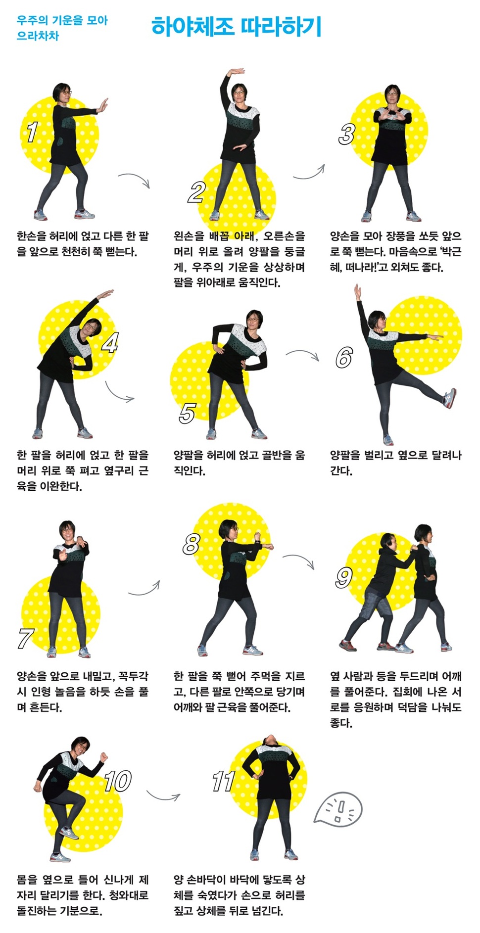 동작마다 특별한 의미가 있나. 구영회 그냥 부위별로 몸을 푸는 거다. (일동 웃음과 야유) 주감독 우리한테는 뭐 있는 것처럼 말하더니, 우주의 기운을 모아서 장풍을 쏜다며. 정희영 (손을 앞으로 쭉 뻗어 흔드는 시늉을 하며) 이건 꼭두각시라고 했잖아. 무대에 올라 시민들과 소통하는 기분은 어떤가. 정희영 11월19일 집회 현장에서 60대 남성이 무대 바로 앞에서 엄청 웃으셨다. 할아버지가 깔깔대면서 아이처럼 웃으시는데, 그런 게 힘인 것 같다. 분노하고 지치는데, 이렇게 예술행동 하는 사람들과 어울리면서 함께 웃는 것. 하야체조는 늘품체조를 빗대 개발한 건가. 구영회 그런 측면도 있는데, 집회에 나온 사람들이 참여할 수 있는 무엇을 만들고 싶다는 생각이 컸다. 집회 끝나고 집에 가다가 안무가 김태균씨랑 즉흥적으로 만들었다. 만들면서 가장 힘들었던 점은 체조가 거기서 거기다보니 늘품체조와 비슷한 동작을 넣을 수가 없었다는 것. 제작비는 얼마나 들었나. 구영회 3천원? 둘이서 김밥 한 줄씩 나눠 먹고 10분 만에 만들었다. 그런데 3천원으로 후딱 만든 게 포인트는 아니다. 우리는 늘품체조에 들어간 비용이나 제작 기간 등을 폄훼하지 않는다. 문화예술 결과물이란 게 가치를 돈으로 환산할 수 없는 거니까. 하지만 문화예술 영역이 권력화되고, 비리의 온상이 되고, 제작 방식이 투명하지 않은 것은 문제라고 생각한다. 늘품체조 자체를 비웃는다기보다, 늘품체조 프로젝트를 통해 체육문화계를 혼란시키고 우롱한 것에 우리는 저항한다. “촛불 불면, 횃불로 번질 것” 게이트가 터지기 전에 차은택씨의 전횡 등 문화예술계에서 눈치채지는 않았나. 하지숙 그렇진 않다. 박근혜 정권 초기부터 문화계를 옥죄긴 했다. 특정 예술단체에 지원금을 막고, 정권이랑 친한 사람들을 문체부 높은 자리에 앉히고…. 그래도 자기들끼리 해먹으려나보다, 정권 말 잘 듣는 가까운 사람들끼리 모이려나보다 했다. 이런 문제는 이전 정권에서도 있었으니까. 하지만 막상 게이트가 터지자 정치·사회적으로 입장과 생각이 다른 사람들이 문화계를 장악한 게 아니었다. 그냥 사적인 전횡이었다는 점에 시민들과 똑같이 충격을 받았다. 박근혜 정권에서 예술인들의 삶은 어땠나. 구영회 말 그대로 먹고살기 어렵다. 예전에는 적게 벌어도 우리가 하는 작업만으로 생계가 가능했다면, 이제는 대부분의 예술인이 따로 아르바이트를 하지 않으면 삶이 어렵다. 어려운 환경에서 즐겁게 싸움을 이어나가고 있는데, 앞으로 광장은 어떻게 움직일까. 정희영 알 수 없다. 게이트가 터지고 한 달여가 지났는데, 지금은 시민들이 그냥 지켜보고 있다는 생각이 든다. 계속 새로운 정황이 밝혀지면서 기름을 들이붓고 있으니 쉴 틈이 없다. 이러다가 폭발하지 않을까. 촛불은 불면 꺼지는 게 아니라, 바람이 불면 횃불로 번진다.