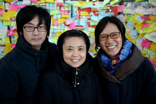 하야체조를 만든 예술인행동단 ‘맞짱’ 사람들. 왼쪽부터 다큐멘터리 감독 주아무개씨, 작곡가 정희영씨, 안무가 구영회씨. 정용일 기자