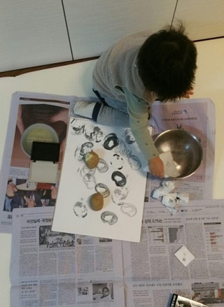 장난감에 관심 보이지 않는 아이에게 감자를 잘라 도장을 만들어 내밀었다. 다행히 관심을 보여 한시름 놓는다. 한겨레 이승준 기자