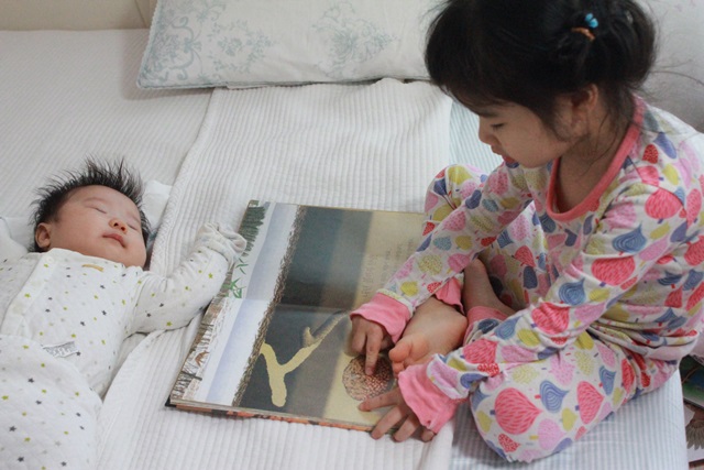 다음날 예상대로 첫째는 동생에게 책을 읽어주겠다며 잠자는 아이를 바운서에 앉혀달라 법석을 떨었다. 둘째는 ‘잠자는 숲속의 공주’처럼 계속 잤다. 다음날 침대에서 잠들려는 동생에게 책읽기를 시도하던 첫째는 “태하, 바보”라며 토라진 목소리로 동생을 타박했다. 둘째는 누나의 책 읽는 소리를 자장가 삼아 잠들었다. 다음날 바운서에 앉아 놀고 있는 동생에게 책을 읽어주던 첫째는 또다시 “태하, 바보”를 외치며 책을 내팽개쳤다. 동생이 옹알이로 책읽기에 화답해주지 않았기 때문이다.