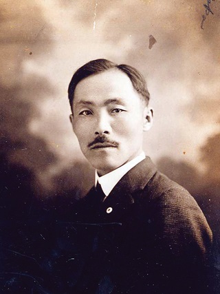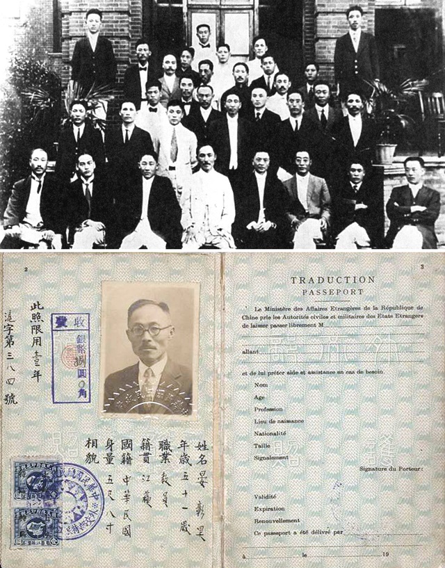 1919년 대한민국 임시정부 구성원. 도산 안창호는 맨 앞줄 왼쪽 네 번째에 앉았다(위쪽). 그는 동남아시아까지 발을 넓히는 항일독립운동에도 힘썼다. 2006년 독립기념관이 공개한 도산의 필리핀행 중국 여권 사진이 이채롭다. <돌베개> 제공, 연합뉴스