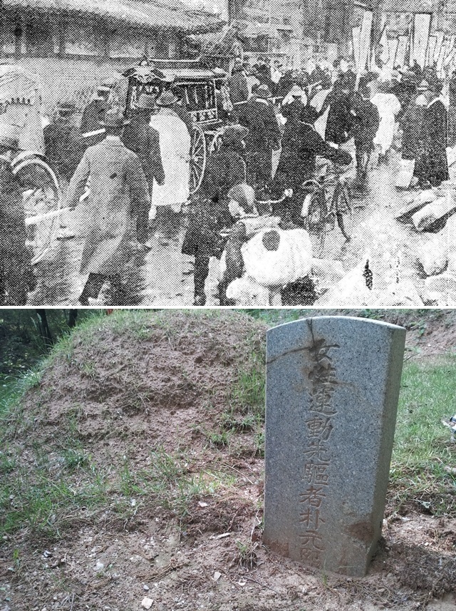 1928년 1월10일 거행된 박원희 장례식 행렬(위). 서울 중랑구 망우리 공원묘원 안국당 무덤 옆 박원희 묘비. 네이버 뉴스라이브러리 갈무리, 임경석 제공