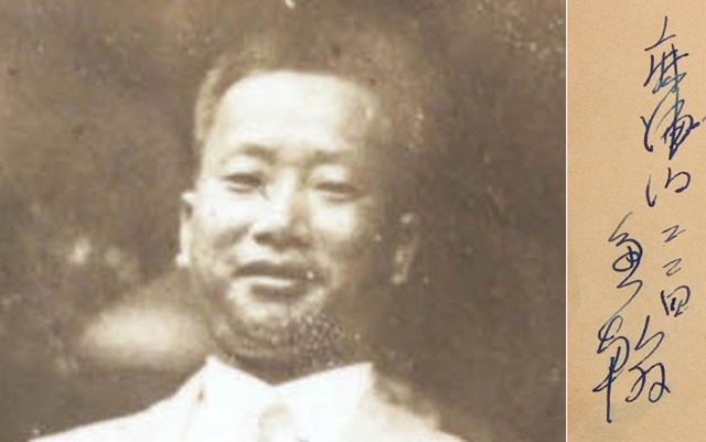 1929년 42살 때 경찰서에서 사진 찍은 김한(왼쪽)의 모습. 국사편찬위원회 제공/ 필적(1928년 1월1일 김재봉에게 쓴 연하장). ‘마포구 224, 김한’이라고 쓰여 있다. 김윤 제공