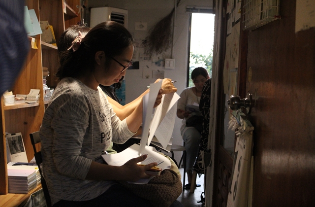 9월13일 저녁, 제주 ‘소심한 책방’에서 열린 간담회에서 한 시민이 강의 자료를 보고 있다. 소심한 책방 제공