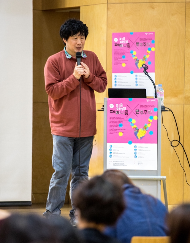 10월18일 서울 마포구 청년문화공간JU동교동에서 열린 ‘지금 여기의 페미니즘x민주주의’ 두 번째 강의는 남자 페미니스트 서민이 맡았다. 그가 어떻게 페미니스트가 되었는지, 남자 페미니스트로서의 고충은 무엇인지, 온라인에서 드러나는 한국 남성의 심리 기저에는 무엇이 있는지 등을 풀어낸 2시간의 강의 여정에 참가한 ‘수강생’들은 깊은 공감을 드러냈다.