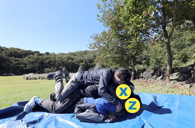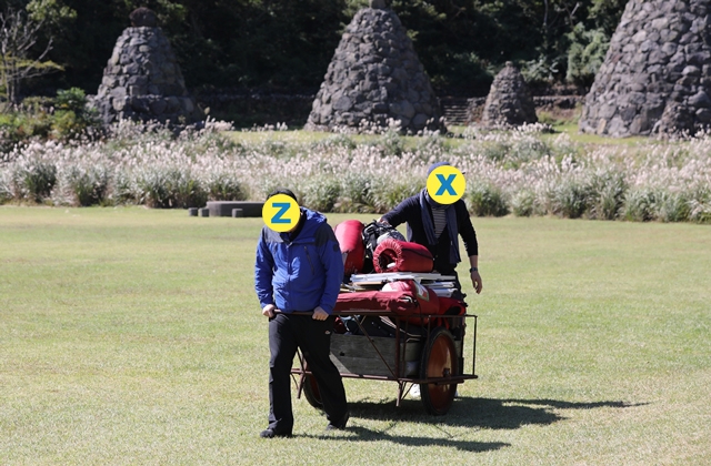 10월13일 오전, 제주 교래자연휴양림에서 텐트를 걷다 말고 정용일 기자와 X·Z가 애정 행각을 벌이고 있다.