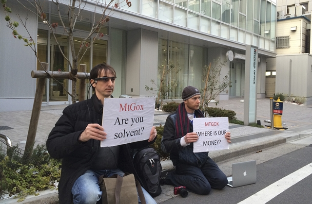 2014년 2월, 일본 도쿄의 비트코인 거래소인 마운트곡스 앞에서 투자자들이 항의시위를 벌이고 있다. AP 연합뉴스
