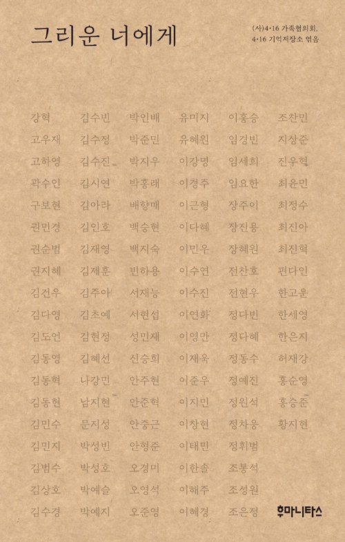 “열여덟 살 그때 그 모습만을 기억하고 있어야만 한다는 게 슬프고 맘이 아리다.”(준혁에게 엄마가) 세월호 4주기를 맞아 (사)4·16가족협의회 부모들이 아들딸에게 보내는 110편의 육필편지를 모았다. 한자 한자 꾹꾹 눌러쓴 편지에 절절한 그리움이 묻어난다.