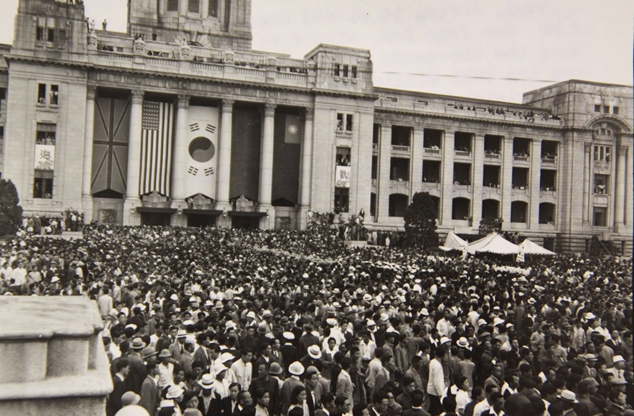 미군 사진병이 찍은 사진❶은 이런 분위기를 역사의 한 장면으로 포착했다. 인파만큼이나 한눈에 들어오는 모습이 중앙청 전면이다. 당시 한국 상황을 이보다 더 잘 보여주는 것이 어디 있을까. 아직 ‘우리’ 국가와 정부를 세우지 못했지만, 민족-국가 수립 운동의 상징이던 태극기가 중앙에 걸리고, 양옆에 4대 열강인 미국·소련·영국·중국 국기가 걸려 있다. 바로 한국의 운명을 틀어쥔, 한국 ‘신탁통치’에 참여하는 국가들이다.