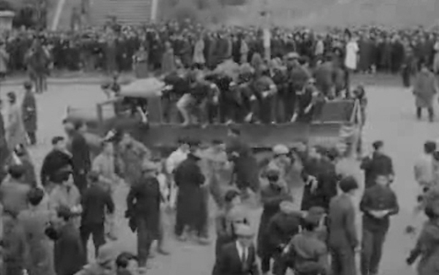 ❶한 무리의 우익 청년들이 트럭에서 급하게 뛰어내린다. 왼쪽 팔뚝에 흰 완장을 차, 다른 사람들과 구별된다. 미국 국립문서기록관리청 소장, 고려대 한국근현대영상아카이브 제공