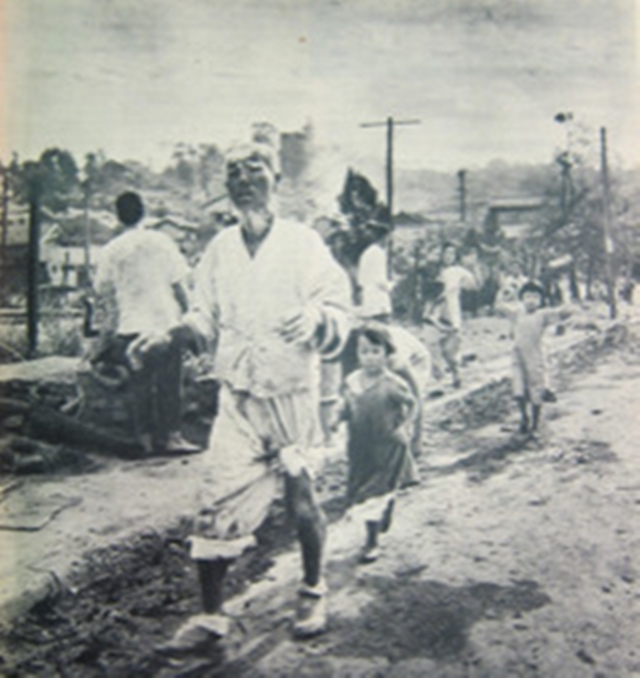 사진❻은 앞선 사진들과 달리 영국의 유명한 포토저널 <픽처 포스트>의 전쟁사진가 하디가 촬영한 것이다. 네이팜탄의 피해를 받은 한 노인이 어디론가 걸어가고 있고, 그 뒤를 한 소녀가 걱정스러운 표정으로 따른다. 뒤의 아이를 안은 여성과 또 다른 여자아이가 두 손을 들고 걸어가고 있다. 그 뒤로 파괴된 채 연기가 올라오는 인천 시가지의 모습이 보인다. 미군 사진병이 촬영한 사진에서는 쉽게 볼 수 없는 장면이다.