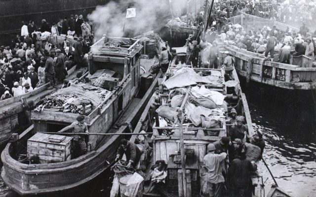❸ 북한 피란민들이 흥남에서 소개하기 위해 물에 뜨는 것이라면 다 활용하고 있다. 부두에 수송선 LST와 고기잡이배로 가득 차 있다. 강성현 제공