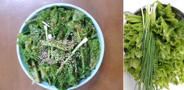 일단 상추와 파를 준비해요. 그걸 씻고 마늘, 고춧가루, 매실액, 식초, 간장을 섞어 양념을 만들어 버무려요. 마지막에 통깨도 솔솔 뿌려요. 여기에 당근이나 양파를 채 썰어 넣어도 됩니다. 이런 재료를 추가하면 아삭아삭 씹히는 게 더 많아져요. 저는 식초를 안 넣을 때는 들기름을 넣고 들기름을 안 넣을 때는 식초를 넣어요. 둘이 궁합이 안 맞아 같이 넣지 않아요. 고소한 맛을 좋아하면 들기름을 넣고 새콤한 맛을 좋아하면 식초를 넣으세요. 쌉싸름하면서 단맛이 나요. 입맛 돌게 해요.