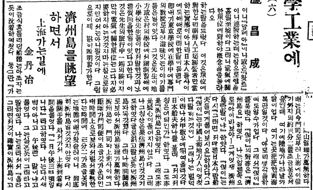 그는 제주도를 바라보면서 고국 사랑을 느꼈다고 썼다. “아! 저것이 과연 제주도이다. 나의 고국의 산천이다”라는 탄성이 마음속에서 솟아났다. “저 땅에서 발을 옮겨놓은 지가 불과 3일이 못 되는”데도 그랬다. 경성을 떠난 것이 3일 전이었다는 말이다. 그런데 “그 땅이 새삼스럽게 그립고 보고 싶었다”고 말했다. 일본 식민지 통치하에서 발간되는 신문에 싣는 글이었음을 고려하면, 매우 위험하고 아슬아슬한 표현이었다.