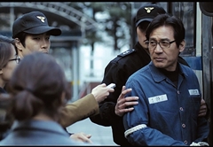 특히 항소심 3차 공판에서 김 교수는 정확한 법적 근거와 논리적 오류를 찾을 수 없는 합리적인 “촉구”로 재판장의 말문을 막는다. 공판을 끝내고 호송버스에 오르기 전, “오늘 재판 어떠셨어요?” 하고 묻는 기자의 질문에 김 교수는 “본 대롭니다. 이게 재판입니까? 개판이지!”라고 대답한다. 분명 글로 읽는 이 대사에는 분노가 느껴질 것이다. ‘개판’이라는 단어는 세고 자극적이다. 하지만 배우 안성기는 이 대사를 놀랍도록 건조하고 차분하게 발화한다. 비아냥거리는 것도, 훈계하는 것도, 역정을 내는 것도 아니다. 말하자면 마치 ‘1+1=2’라는 것에 의심이 없듯이 방금 법정의 상황은 ‘재판’이 아니라 ‘개판’이라고 정답을 내놓는 태도다. 그리고 마무리 인사를 하듯 살짝 보내는 고갯짓으로 이 40초 비트의 마침표를 찍는다.