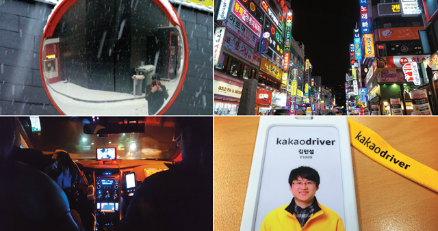 (왼쪽 위부터 시계 방향으로) 맥도날드 알바 중 도로 반사경 앞에서. 대리운전을 하던 어느 날 길거리 풍경. 카카오 대리운전을 시작하고 받은 사원증(?). 대리기사들이 택시를 타는 이른바 ‘택틀’ 중 찍은 사진. 김민섭 제공