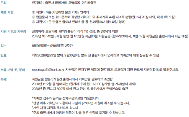 무엇보다 <한겨레21>은 르포를 쓰고 싶지만 생활 형편이 어려운 이들의 곤경을 덜어주는 방법을 고민했습니다. 지원 공모제는 ‘지속가능한’ 석 달간 지원금을 지급하는 방식입니다. 나아가 출판사와 연계해 책 출간으로 이어지는 선순환을 공모제 속에 마련했습니다. 3개월의 지원금은 액수는 적지만 당신이 시작하고 꿈을 꿀 숨통을 틔워주는 계기가 되리라고 확신합니다.