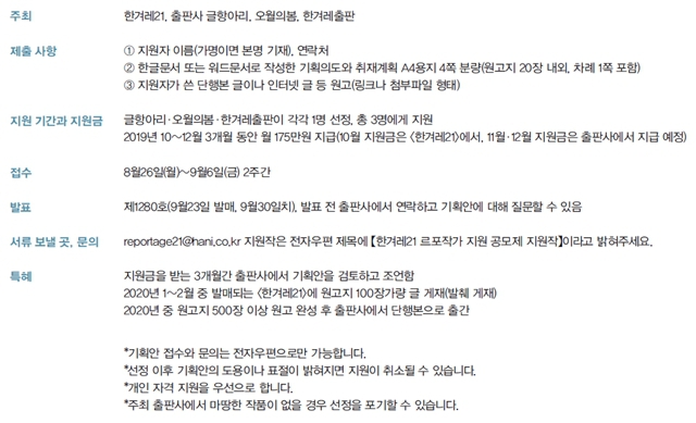 무엇보다 <한겨레21>은 르포를 쓰고 싶지만 생활 형편이 어려운 이들의 곤경을 덜어주는 방법을 고민했습니다. 지원 공모제는 ‘지속가능한’ 석 달간 지원금을 지급하는 방식입니다. 나아가 출판사와 연계해 책 출간으로 이어지는 선순환을 공모제 속에 마련했습니다. 3개월의 지원금은 액수는 적지만 당신이 시작하고 꿈을 꿀 숨통을 틔워주는 계기가 되리라고 확신합니다.