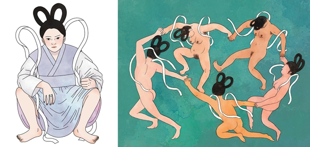 퇴고 과정에선 삽화 이미지도 달라졌다. “서양 미의 기준에 맞춰져 있다는 생각”(유진)에 선화공주 자매의 이미지에서 화장을 덜어내고, 쌍꺼풀을 지웠다. 목욕하는 선녀들은 피부색과 체형이 제각각이다. “체모가 있는 여성 누드는 외설적으로 여겨졌다. 성적 대상화하지 않는 여성의 몸을 그리고 싶어서 체모를 그대로 뒀다. 또 뱃살도 있고, 근육질도 있는 다양한 여성의 몸을 살리려고 했다.”(유진)