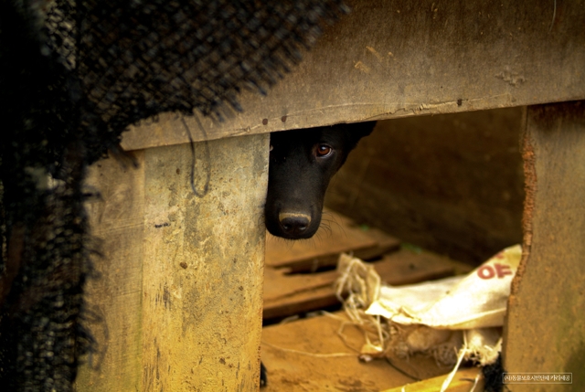 식용 개농장에서 사육되는 개가 방문자를 겁먹은 얼굴로 바라보고 있다. 하재영 제공, ©팀 옐로우 독, 동물권 행동 카라