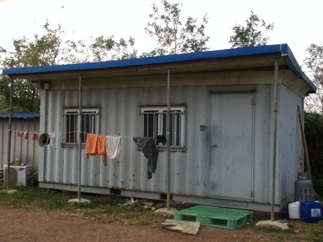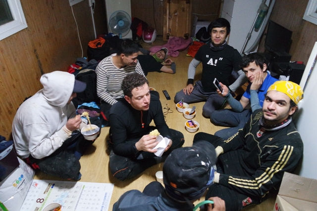 육계 농장 상차반(출하할 닭을 닭장차에 싣는 것만 전문적으로 하는 팀)의 휴식 시간. 이들은 이집트인이다. 가운데 앉은 곱슬머리 남자는 내가 라면 수프에 돼지고기 성분이 들어 있다고 하자, 한참을 고민하다 면만 먹었다. 한승태 제공
