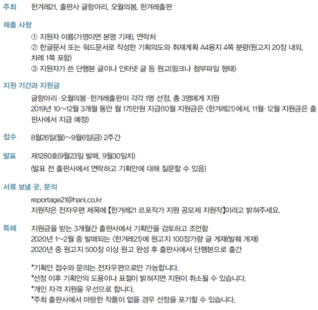 무엇보다 <한겨레21>은 르포를 쓰고 싶지만 생활 형편이 어려운 이들의 곤경을 덜어주는 방법을 고민했습니다. 지원 공모제는 ‘지속가능한’ 석 달간 지원금을 지급하는 방식입니다. 나아가 출판사와 연계해 책 출간으로 이어지는 선순환을 공모제 속에 마련했습니다. 3개월의 지원금은 액수는 적지만 당신이 시작하고 꿈을 꿀 숨통을 틔워주는 계기가 되리라고 확신합니다.