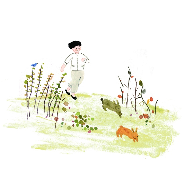 토끼는 똥도 동글동글하게 예쁘게 쌉니다. 토끼똥을 보면 토끼 길을 쉽게 따라갈 수 있습니다. 토끼 길을 따라 올라가자 잿빛 토끼는 한가롭게 앉아 놀고 있습니다. 토끼는 내가 있는 걸 전혀 무서워하지 않는 것 같습니다. 토끼는 앞다리가 짧아 비탈길로 내려가는 것을 잘 못합니다. 나는 토끼를 산 아래쪽으로 몰아서 잡을 생각입니다. 내가 “이놈!” 하고 소리치자 화들짝 놀라 아래로 뛰어 내려갑니다. 오늘은 토끼를 잡을 수 있을 것 같습니다. 한참을 내리 달리다가 손을 뻗어 토끼를 덮치려는 순간 무엇이 내 모가지를 획 낚아챘습니다. 바로 앞에 가늘고 긴 칭물개덩굴(이른 봄에 나는, 잎은 나물로 먹고 쫀드기라는 열매가 달리는 가시덩굴)이 있는 것을 몰랐습니다. 목에서 귀밑까지 가시덩굴 자국이 시뻘겋게 나고 피가 맺혔습니다. 토끼는 나 잡아보란 듯이 산 위로 뛰어 올라갔습니다.