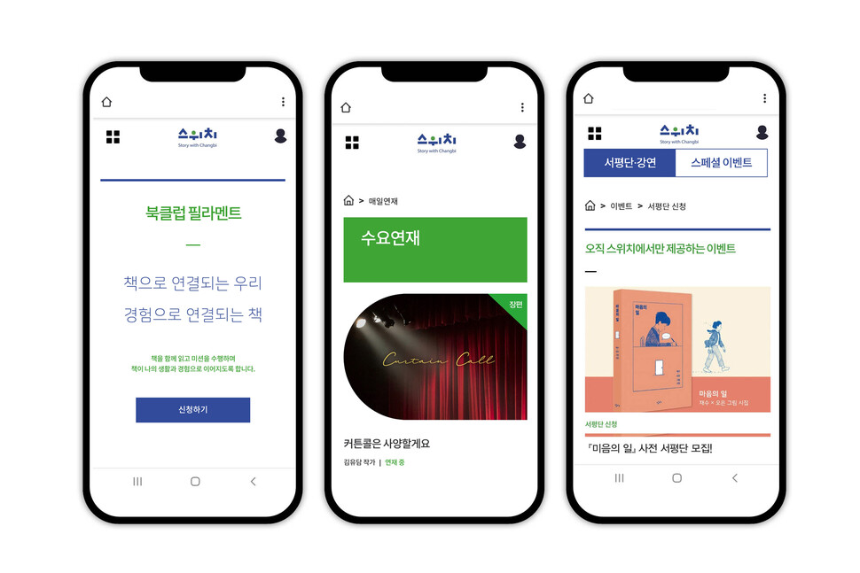 스위치 창비가 2021년 2월 론칭한 종합독서체험 플랫폼. 시·소설·산문·칼럼·만화 등 다양한 작품이 연재될 뿐만 아니라 ‘클럽 창작과비평’ ‘북클럽 필라멘트’ 등의 독서모임에 참여할 수 있다. ‘북클럽 필라멘트’는 평균 5천∼1만원가량의 참가비를 내야 한다. 작가·편집자·마케터 등이 ‘북메이트’로 참여하고 필사, 글쓰기, 사진·영상 촬영, 달리기 등 책과 연결된 다양한 미션을 함께 수행한다. 김현 시인과 함께 매일 일상 속에서 단어를 채집해 기록하는 ‘단어 채집 생활’ 등이 인기다. 이정원 창비 과장은 “곧 회원이 2만 명을 돌파할 것으로 보이는데, 여성이 80%, 2030이 70% 정도”라고 설명했다. 이곳에서 연재했던 황정은 작가의 <일기>와 장류진 작가의 <달까지 가자>는 ‘스위치 에디션’을 따로 만들어 선판매를 진행했다.