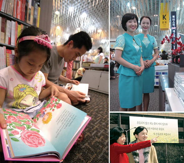 왼쪽부터 시계 방향으로 교보문고 광화문점, 교보 북마스터들, 교보생명 본사 외벽 대형 글판.