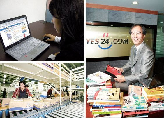 왼쪽 위부터 시계방향으로 한 여성이 인터넷 서점에서 책을 주문하고 있는 모습, 김동녕 예스24 회장, 예스24 파주 물류센터.