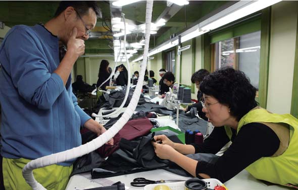 11월6일 아침 9시. 생산부끼리 모인 조회에서 전날 작업에 대한 평가와 당일 업무를 공유하고 난 뒤 함께 ‘파이팅’을 한번 외친다. 그때부터 생산실에서는 10여 대의 미싱이 분주하게 돌아간다. 신현섭(47) 생산부장은 2층과 3층을 오르내리며 원부자재를 챙기고 완제품을 검사하고 재단팀의 일손도 돕는다. 전국공무원노동조합에서 주문한 단체복 점퍼 1천여 벌을 11월 중에 납품하려면 눈코 뜰 새가 없다. 교보생명 다솜이 사회봉사단의 조끼 300벌과 신생 저가항공사 이스타항공의 승무원 제복도 수주했다. 패션·정보기술(IT) 등 다양한 업종 출신들이 뭉쳐 마케팅, 상품기획, 디자인 등을 수행하는 기획실부터 봉제·샘플·재단 등을 맡는 생산실까지 30명 남짓한 식구들이 지난 한 달 새 이뤄낸 성과다. 그들은 어떻게 알고 서로 모였을까.