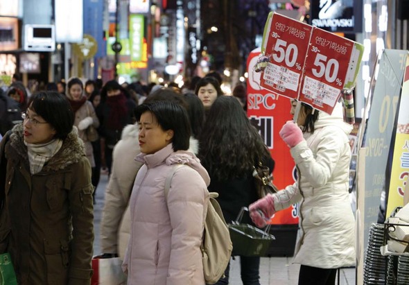 지난 12월5일 서울 명동에서 한 화장품 판매점 직원이 깍아팔기 안내 손팻말을 들고 손님들을 모으고 있다.
