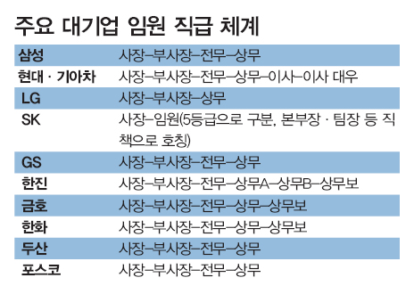 SK그룹은 지난해 말 아예 임원 직급 체계를 없앴다. SK그룹의 임원 직급 체계는 ‘사장-부사장-전무-상무’로 짜였으나, 직급제가 폐지되면서 사장과 회장을 제외한 직급에 대해서는 ‘센터장’ ‘부문장’ ‘실장’ 등 각자 맡고 있는 직책으로만 부르고 있다. 다만 내부 기준에 따라 임원을 5등급(A~E)으로 구분만 한다.