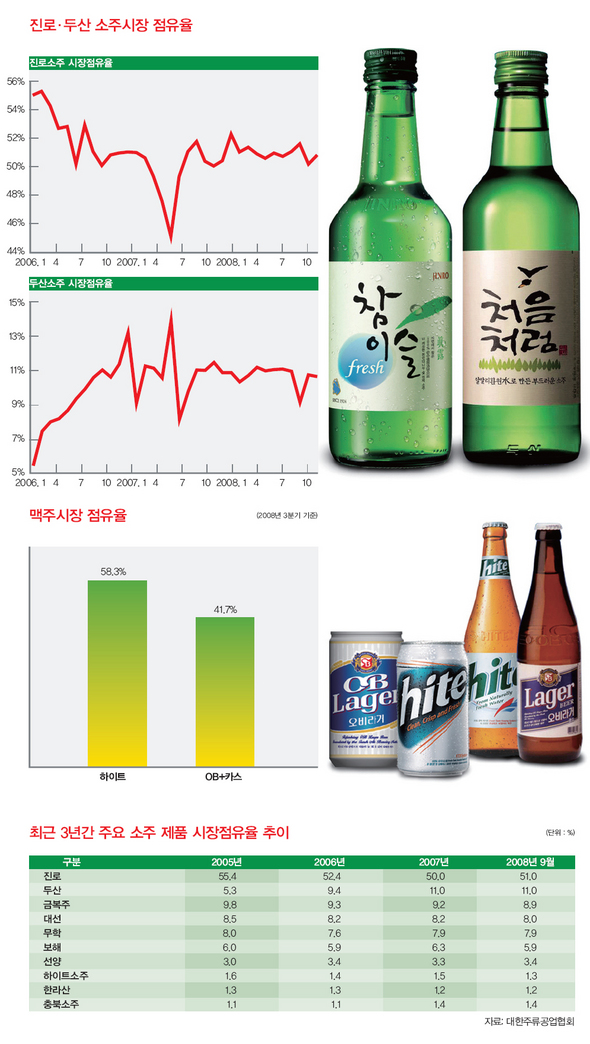 두산은 1952년 동양맥주(OB맥주의 전신)로 주류 사업을 시작한 뒤 1994년 경월소주를 인수해 소주 사업으로 영토를 확장했다. 하지만 1998년 OB맥주를 외국 회사에 매각한 뒤 이제 소주와 와인 사업도 팔기로 해 주류 업계의 전설로만 남게 됐다. 두산의 소주 승부수는 2006년에 던져졌다. 1998년 이후 계속된 소주의 저도화 추세 속에서 두산은 2006년 2월 세계 최초의 알칼리 환원수 소주라는 야심작 ‘처음처럼’을 내놨다. 그해 9월에 월 판매량 100만 상자를 돌파하며 시장에 선풍을 일으켰다. 확고한 브랜드 포지셔닝과 함께 타깃 소비자층인 25~35살 직장인과 여성층에 대한 마케팅이 적중한 것이다. 그러나 곧바로 진로의 진노가 이어졌다. 수도권에서 절대적인 시장 지위를 확보하고 있던 진로는 그해 8월 업계 최초로 설탕을 빼고 핀란드산 순수 결정과당을 사용했다는 ‘참이슬 후레쉬’로 맞불을 놓는다. 지방 소주회사들도 경쟁적으로 저도주 제품을 출시해 2007년 이후 두산은 더 이상 약진을 하지 못했다. 주류 도매상에 대한 교섭력 약화와 수도권·강원 지역을 제외한 대부분 지방의 유통망 미비도 시장점유율 정체의 원인으로 자체 분석했다.