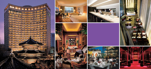 신라호텔 전경과 로비, 영빈관, 주방 사진.