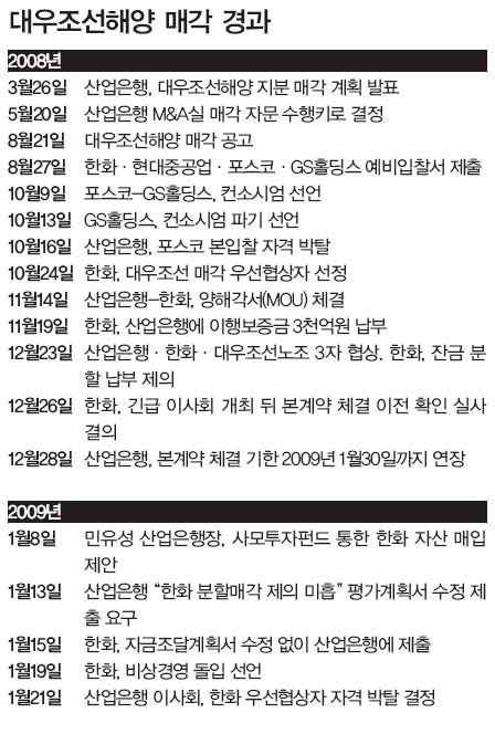 하지만 축배를 들 시간은 너무 짧았다. 미국발 금융위기로 실탄이 마르기 시작하면서 상황은 급변했다. 나라 안팎에서 돈줄이 말라갔다. 하나은행·농협 등 대출 의사를 밝혀온 은행들은 냉정했다. 신용 경색을 이유로 자금 지원 규모를 애초 예정보다 줄인다는 방침을 한화에 통보했다. 마지막까지 기대했던 중동 자금 유치도 무산됐다. 부동산·증권시장 급랭으로 계열사 지분 및 사옥 매각도 제값을 받지 못하게 됐다. 그사이 이구택 회장과 허창수 회장은 대우조선 인수에 관심 없다며 비판을 툴툴 털어버렸다.