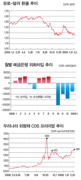 우리나라 5년 만기 외국환평형기금채권(외평채)의 CDS 프리미엄은 지난해 상반기 1%포인트(100bp) 안팎에 머물렀으나, 9월부터 급등하기 시작해 10월29일 6.99%포인트까지 뛰었다. 이후 한-미 통화 스와프 개설로 급락해 11월4일 2.52%포인트까지 내렸다. 큰 폭으로 등락하던 CDS 프리미엄은 올 2월 들어 2.6%포인트대에서 상승을 시작해 3월4일 4.65%포인트까지 상승세를 이어가고 있다. 멕시코·브라질 등 우리나라와 CDS 프리미엄 수준이 비슷한 나라들도 같은 움직임을 보이고 있다.