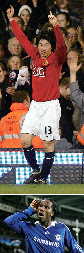 맨유 박지성 “삼성전자 유니폼 입어볼까?”(위), 첼시 디디에 드로그바 “뭐? 그럼 우린 어쩌구!”(아래). 사진으로 구성해본 두 선수의 대화다. 삼성전자의 속마음은 지금 어느쪽으로 기울고 있을까. 사진 REUTERS/ EDDIE KEOGH · AP PHOTO/ MASSIMO PINICA