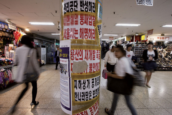 지금 지하도 상가는 ‘화약고’가 됐다. 노후 상가의 리모델링 추진이 사단이다. 전국지하도상가상인연합회(이하 연합회)는 지난 2월 “서울시가 시내 지하도 상가 리모델링 공사 경쟁입찰 추진 과정에서 특정 업체와 유착한 의혹이 있다”며 오세훈 서울시장을 ‘공무원 직무집행 관련법 위반’ 혐의로 고소했고, 이에 맞서 서울시는 지난 3월23일 정인대 연합회 이사장을 명예훼손·모욕·공무집행방해 혐의 등으로 서울중앙지검에 고소한 상태다. 서울시는 리모델링 공사를 추진하기 위해, 최근 계약 기간이 만료됐지만 계약 갱신을 요구하며 점포를 비우지 않는 1천여 점포 상인을 대상으로 가게를 비우기 위해 명도소송을 진행하고 있다. 이에 맞서 상인들은 통로 기둥과 점포 벽면에 서울시와 재벌을 비난하는 문구를 붙여놓고 있다.