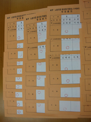 KT민주동지회 조합원들은 지금까지 나온 언론 보도와 180도 다른 얘기를 했다. 이들은 회사 쪽이 조직적으로 투표에 개입하거나 사주했다는 주장을 폈다. 감시와 통제 속에 조합원들이 자신의 의사에 따라 자유롭게 투표할 수 없었다는 주장이었다. ‘구석 찍기’와 ‘팀별 줄 투표’를 강요하며 조합원 한 사람 한 사람을 감시·통제했다는 것이다. “팀별로 기표용지 특정 위치에 찍게 해” 민주동지회 조합원들은 그 근거로 지난해 말에 열린 노조위원장 선거 결과를 들었다. 지난해 12월3일 KT노조위원장 선거가 열렸다. 기호 1번 김구현 후보는 보수 성향을 지닌 옛 집행부에서 지지했다. 2번 조태욱 후보는 KT민주동지회가 지지한 후보였다. 투표 결과, 김구현 후보와 조태욱 후보는 각각 48.75%, 42.79%의 득표율을 올려 백중세였다. 과반수 득표를 한 후보가 없어 두 후보는 12월9일 2차 결선 투표를 치른다. 2차 투표에서 김 후보가 68.02%의 지지로 당선됐다. KT민주동지회 조아무개 조합원의 얘기다. “KT 조합원들이 민주노총에 대한 정서가 안 좋은 것은 맞습니다. 하지만 95%까지는 아니에요. 조합원 정서가 그랬더라면 지난 노조위원장 선거에서 1번 후보가 압도적으로 지지를 받았겠죠. 그런데 그렇지 않았거든요. 왜일까요? 지난해 말에는 회사 쪽이 선거에 개입하지 못했기 때문입니다.” 지난해 11∼12월 KT엔 큰일이 있었다. 남중수 전 KT 사장이 비리 혐의로 구속됐고, 이어 KT 새 사장 공모가 진행되는 중이었다. KT의 최고 핵심부가 진공상태인 시기였다. “어수선했을 때죠. 그러다 보니 회사에서 조직적으로 선거에 개입하기 힘들었어요. 노동 탄압이 일시적으로 느슨해졌기 때문에 2번 후보가 그렇게 높은 지지를 받을 수 있었던 거예요. 그러다 새 사장이 선임되면서 확 바뀌게 된 거죠.”(장아무개 조합원) KT민주동지회 사람들이 주장하는 회사의 개입은 이런 식이었다. KT노조 선거와 투표는 전국 440개 지부에서 치른다. 소규모 단위의 지부별로 투표와 개표를 하기 때문에 지부의 투표 성향이 드러날 수 있다. 이런 사정을 이용해 A팀장은 10명의 팀원들에게 기표용지의 왼쪽 상단에 도장을 찍게 하고 B팀장은 7명의 팀원들에게 오른쪽 상단에 찍게 해 투표 결과를 사후에 확인할 수 있게 한다는 것이다. 이른바 구석 찍기다. 또 팀별로 같은 시간에 투표를 하게 하는 팀별 줄 투표도 강요한다는 것이다. 사실상 공개투표로 진행한다는 주장이었다. 처음엔 KT민주동지회 조합원들의 주장을 믿기 힘들었다. 하지만 그들은 지난해 노조위원장 선거에서 입수한 것이라며 몇 개의 자료(사진)를 내밀었다. 그 사진들에는 한결같이 구석 찍기로 기표한 흔적이 역력했다. “관리자들의 압력은 기본입니다. 관리자들도 투표율이 낮거나 회사에 반대되는 투표율이 높으면 인사 전보 조치를 당합니다. 이 때문에 관리자들은 노조 선거에 일일이 다 신경을 쓸 수밖에 없습니다. 이런 상황에서 조합원이 기표소에 들어가 자기가 찍고 싶은 대로 투표하기가 힘듭니다. 기표소 뒤에 CCTV라도 있는 듯 위축될 수밖에 없어요.”(김아무개 조합원) “관리자들이 조합원의 성향을 거의 다 알고 있죠. 투표가 끝난 뒤에도 이탈 표가 나올 경우 관리자들이 조합원에게 일일이 ‘누구 찍었냐’ ‘찬성 찍었냐’라고 물어보며 이탈 표를 찍은 조합원을 찾아내죠. 그런 투표가 한두 번이 아니었는데, 누가 자기 마음대로 투표를 할 수 있겠어요.”(이아무개 조합원) 소규모 지부별로 투표와 개표를 하는 게 문제인 것 같았다. 기자가 “지부별로 하지 말고 몇 개 지부를 통합해 투표를 하면 그런 의혹을 없앨 수 있지 않느냐”고 물었더니, KT민주동지회 조합원들은 “KT노조가 반대하기 때문에 못하고 있는 것”이라고 입을 모았다.