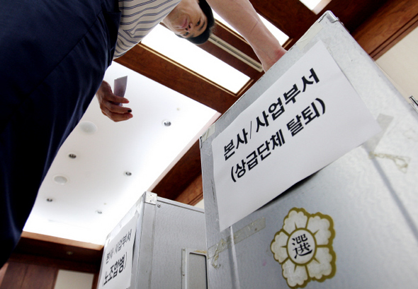 7월17일 경기 분당 KT 본사에서 KT노조가 상급단체인 민주노총 탈퇴 여부를 결정하는 조합원 찬반 투표를 진행하고 있다. 사진 연합 진성철