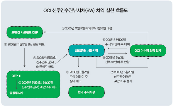 시공간을 초월한 이 연계고리를 이해하려면 금융상품과 거래기법에 대한 약간의 지식이 필요하다. 이자를 받는 채권이면서 주식으로 바꿀수 있는 신주인수권부사채(BW)란 게 있다. 전환사채(CB)와 다른 점은 채권과 주식의 권리가 분리될 수 있다는 데 있다. ‘분리형 BW’라고 하는데, B(채권)는 그대로 있고 W(신주인수권리)만 떼내 팔 수 있다. 예를 들어 1만원을 내면 주식 1주를 받을 수 있는 권리가 있는데 주가가 1만5천원이라면 W 가격은 대체로 그 차액인 5천원+알파(주가의 추가 상승 가능성에 대한 프리미엄)로 형성된다. 이와 같은 BW를 보유한 ㄱ씨가 프리미엄을 받고 W를 ㄴ씨에게 팔았다. ㄴ씨는 주가가 계속 오르자 아예 주식으로 바꾸려고 한다. 그런데 신주를 신청해서 받기까지는 보통 열흘 안팎의 기간이 걸린다. 혹시 그 사이에 주가가 떨어져버린다면 ㄴ씨는 낭패다. 그래서 그 회사의 주식을 가지고 있는 ㄷ씨를 찾아가 열흘 뒤에 갚아줄 테니 주식을 좀 빌려달라고 부탁한다. ㄷ씨가 깐깐하게 굴어 대여 수수료를 더 얹어줬다. ㄴ씨는 주식을 빌려오자마자 즉시 시장에 내다 판 뒤 나중에 들어온 신주를 ㄷ씨에게 돌려줬다. 여기서 ㄱ씨는 2005년 11월 OCI가 발행한 해외 사모 BW를 인수한 케이맨제도의 사모펀드인 OEP다. 인수 금액은 원화 기준 1천억원으로, 신주를 인수할 수 있는 행사가액은 주당 3만1650원이다. OEP는 2008년 5월20일 ㄴ씨에게 W 94만여 주를 주당 35만6천원대에 넘겨 3400억원에 가까운 차익을 실현한다. W를 사들인 ㄴ씨는 UBS증권 서울지점이다. UBS는 같은 날 OCI 94만여 주를 ㄷ씨에게 빌려 그 다음날인 5월21일 장내에서 40만원대에 팔아 매매 차익으로 413억원대를 움켜쥔다. 주식을 빌려줬던 ㄷ씨는 이 회장과 두 아들이다. UBS는 신주인수권을 행사해 받은 주식을 6월3일 이 회장 일가에게 되돌려준다. 별도 펀드에 넘기고 다시 공동투자자에게 그런데 앞의 일반적 사례와 결정적으로 다른 점은 ㄱ씨와 ㄷ씨가 ㄴ씨를 뛰어넘어 직접 연결돼 있다는 것이다. OCI와 OEP는 BW의 발행자와 인수자의 관계인 것이다. 이 BW는 OCI가 미국의 카본블랙 업체인 컬럼비안케미컬 인수 자금을 마련하기 위해 발행했다. 하지만 추가 자금 지원 부담을 느껴온 OCI는 지난해 말 컬럼비안케미컬을 OEP에 매각하는 계약을 체결했다. 이수영 회장이 OEP의 BW 차익 극대화를 위해 주식을 빌려주면서까지 적극적으로 나선 이유가 드러나는 대목이다. 문제는 OEP의 실체다. JP모건 계열의 사모펀드인 OEP는 2005년 11월 BW를 인수하자마자 무슨 이유에서인지 ‘OEPⅡ’라는 내부의 별도 펀드에 전량 넘긴다. 실질적 권리자가 따로 있었던 셈이다. OEP는 이 사실을 공개하지 않고 있다가 1년이 지나 뒤늦게 밝혔다. 또 2006년 3월과 6월 두 차례에 걸쳐 OEPⅡ로 넘어온 BW 중 일부에서 W만 떼내 OEPⅡ의 공동투자자 2인에게 매도한다. 이 사실 역시 1년 넘게 숨기고 있다가 2007년 8월에야 정정 신고서를 내면서 드러났다. 하지만 OEP는 공동투자자들에 대해 ‘다수의 소유자’라고만 언급하고 있어 그 실체는 베일에 가려 있다. OEP에서 뒤늦게 첨부한 임원 현황에 한국계로 보이는 인물이 2명 있다. 그중 1명은 2006년 3월 OCI의 사외이사로 선임돼 1년6개월간 일했다. 그는 또한 이수영 회장의 장남인 이우현 OCI 이사가 현재 대표로 있는 컬럼비안케미컬홀딩스의 공동대표였다. 이우현 이사는 이번 OCI 주식 불공정거래 혐의로 검찰에 수사 통보됐다. 참으로 복잡 미묘하다.
