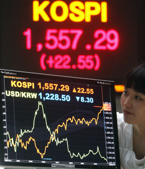 7월31일 코스피지수는 전날보다 22.55포인트(1.47%) 오른 1557.29로 장을 마쳤다. 코스피지수가 1550선까지 오른 것은 지난해 8월18일 이래 1년여 만이다. 유가증권 시장의 시가총액도 1년여 만에 800조원을 넘어섰다.