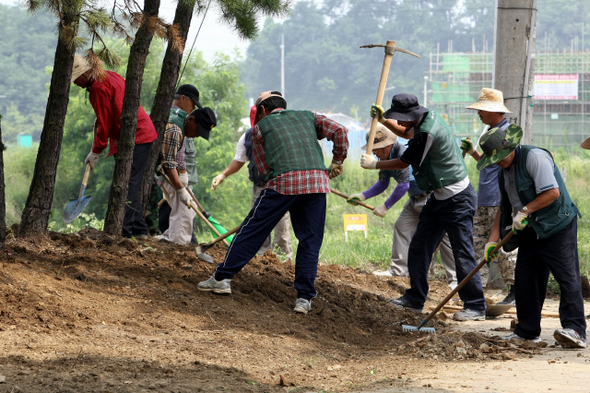 희망근로 참가자들이 7월16일 경기 시흥시 정왕동 그린테마동산 조성사업 현장에서 화단을 가꾸고 있다. 사진 한겨레 이정아 기자
