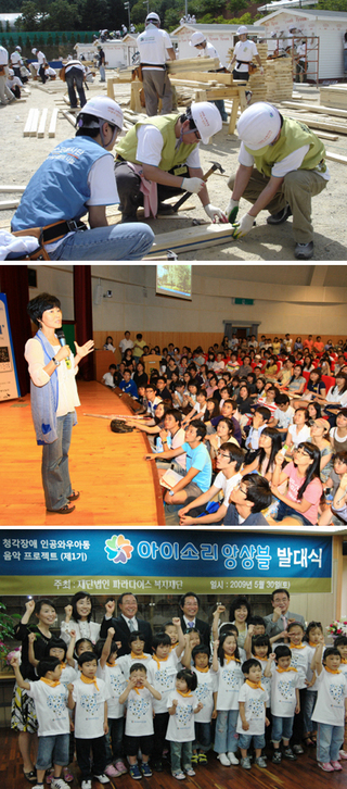 맨 위부터 포스코 사회봉사단원들이 주거여건이 좋지 않은 태국 촌부리 지역에서 ‘사랑의 집짓기’ 활동을 벌이고 있다. 예스24가 수도권 보다 문화 접근이 떨어지는 지방 사람들을 위해 ‘책 읽는 강의실’이란 전국 투어 강연회를 진행하고 있다. 파라다이스복지재단이 청각장애 어린이 합창단 ‘아이소리앙상블’을 창단하고 ‘작은 공연’을 준비하고 있다. 사진 맨 위부터 포스코·예스24·파라다이스복지재단 제공